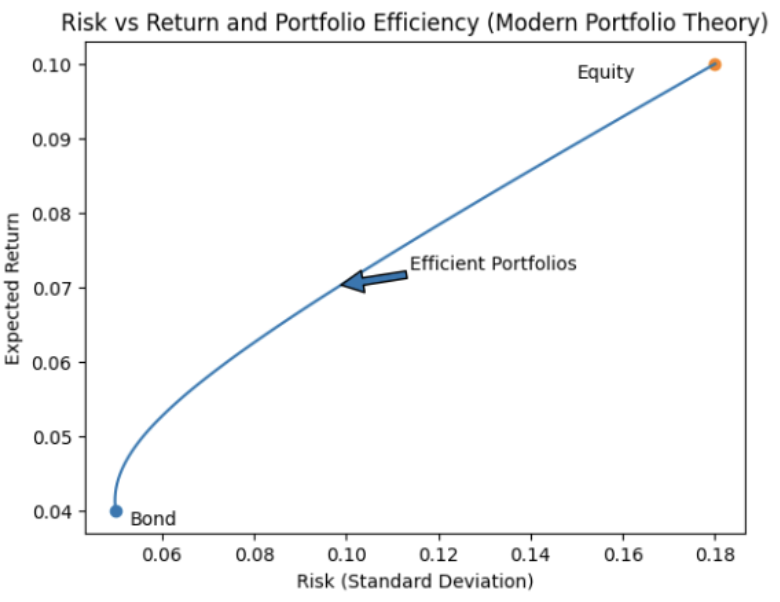 Illustration: In the diagram below, you can see a simple illustration of this concept. Investing all your money in bonds will produce an expected return of 4% with risk of 5%. Investing all in Equities will give an expected return of 10% but with risk of 18%. The arrow points to a portfolio of 50% Equity, 50% Bonds. The expected return is a simple average of 7% (=(4%+10% / 2) but the risk is only 10% (less than the simple average of the risk components (18%+5%/2 = 11.5%). This means a better return per unit of risk. It’s more ‘efficient’.