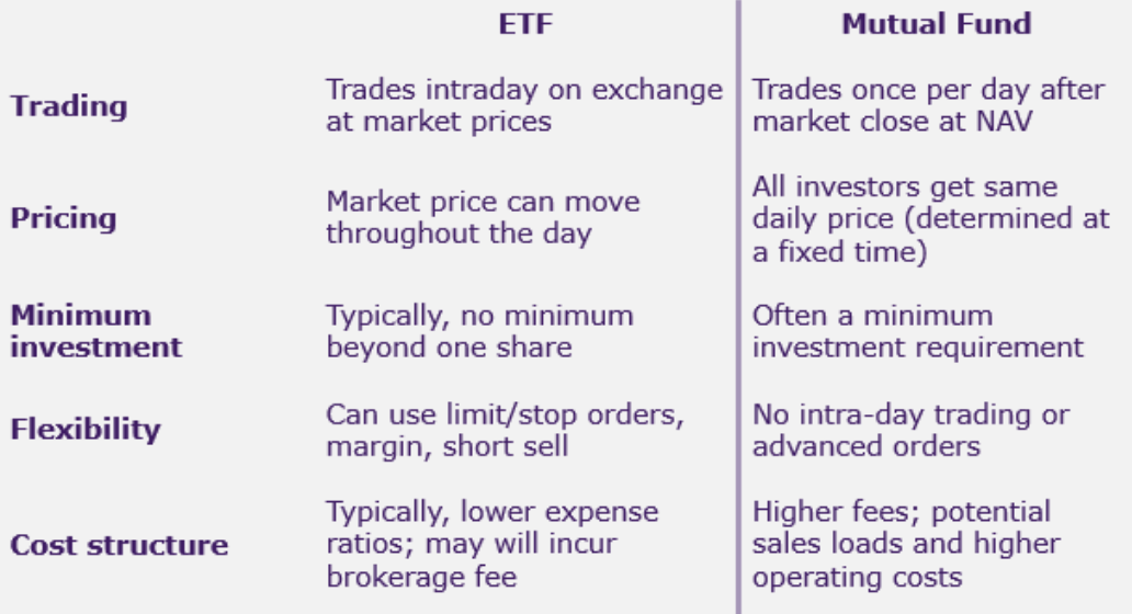 | Trading Structure Differs Fundamentally | ETFs trade intraday on exchanges at market prices, while mutual funds transact once daily at net asset value (NAV). |