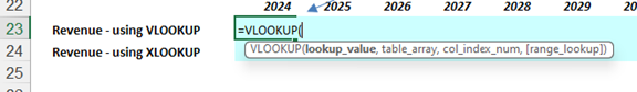 We still enter firstly the lookup_value, but then the lookup_array is just the column of cells containing the scenario names (B13:B17) and we then enter the return_array which is the column of cells containing the revenue data for 2024. Do no dollarize the return array, and when the copy the formula across the time series, the return array will follow the formula. So there is no need to specify a column_reference as with Vlookup. Much more versatile!